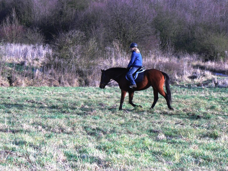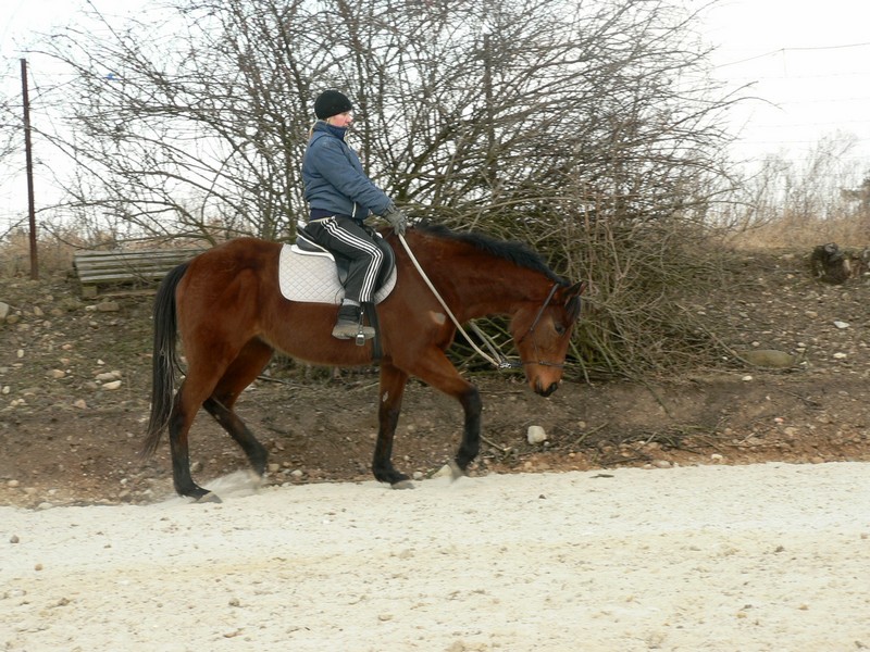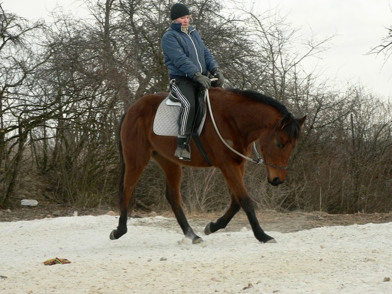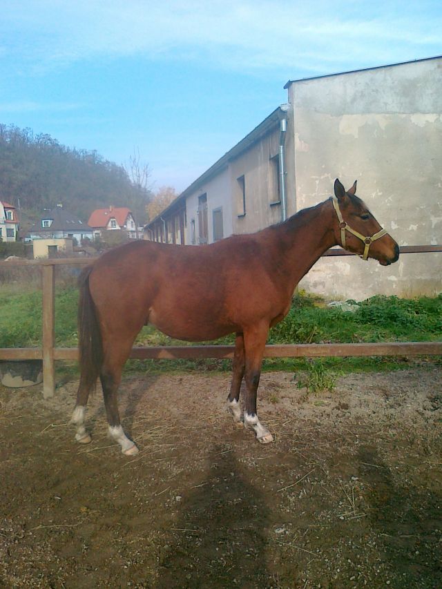 Foto z prvních krůčku drezůrní přípravy pár dní po Mařenčině stěhování. Drezura je samozřejmě pro dosud pouze dostihově připravovanou Mařenku úplné novum.